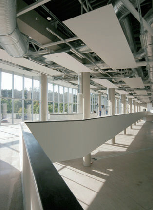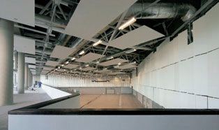 The most prominent feature of the new building, its diagonal elevation – or rather opening – is thus revealed as if by cutting an imaginary enclosed square volume. The vibrant, reflective glass screen encourages visitors to wander around without being constrained by a sense of „inside“ and „outside“. Actually, the architects’ design statement reveals a deliberate intention to eliminate the main elevation in favour of the smooth transition of space. The diagonal „cut“, the longest facade, allows daylight to flood the building. To further emphasize the overlapping of inside and outside spaces, the roof extends out over the glass screen, creating a canopy in front of the building. Dramatically touching the ground with a sharp-angled corner, the concrete structure of the pavilion also becomes the high point of the Expo piazza, without being in any way intrusive or pretentious.