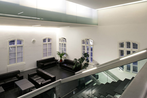 Toll ist der Hauptraum, der jetzt das ganze Gebäude aufschließt. 20 Meter hoch, mit einer Freitreppe, für die sich die Geiswinklers eine spezielle Handlauf-Lösung haben einfallen lassen, lichtdurchflutet (Oberlichten), großzügig, freundlich und offen. Es ist geradezu rührend, wenn man sieht, wie die Leute, die hier arbeiten, mit dieser Architektur umgehen: Sie ziehen die Schuhe aus.