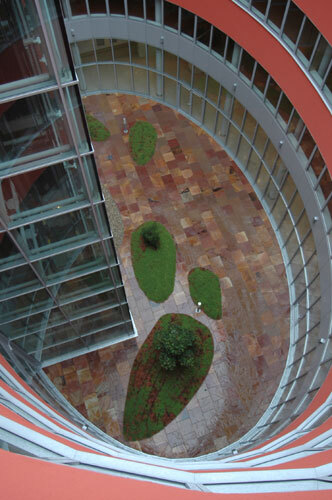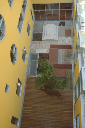 Peichl & Partner haben das Haus so einfach wie möglich angelegt. Der Straßentrakt erstreckt sich über 80 Meter Länge, dahinter gliedern zwei Höfe die in die Tiefe des Bauplatzes ausgreifenden Bauteile. Der erste Hof ist oval, durch ein sattes Rot (eine Referenz Richtung japanische Flagge) gekennzeichnet. Der zweite Hof ist gelb. Und die Bodenfläche wurde nach therapeutischen Vorgaben gestaltet: Es gibt sehr unterschiedliche Oberflächen, auch eine kleine Treppe, die man hinauf- und hinuntersteigen kann. Dieses Thema wird im Garten an der Rückseite des Hauses noch einmal und in größerem Umfang umgesetzt: Da gibt es dann einen Parcours, dem unterschiedliche Erlebnisbereiche zugeordnet sind - vom duftenden Rosengarten über Wasser und Seerosen bis zu einem Pavillon, einem Grillplatz, im kommenden Frühjahr auch einem Kirschgarten.