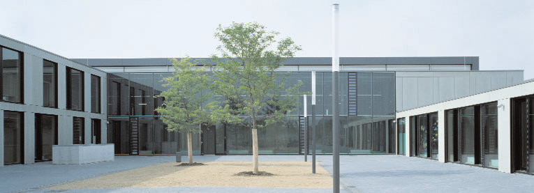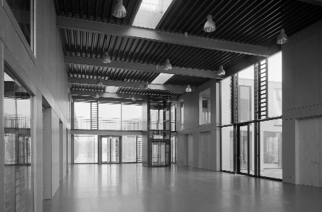 Das von allen Seiten fußläufig zu erreichende Stadtteilzentrum ist als öffentliches Gebäude transparent gestaltet, um die bürgernahe Nutzung nach außen zu betonen. Vom Forum aus lassen sich die einzelnen Nutzungen auf kurzem Weg erreichen, gleichzeitig haben diese jedoch auch eigene Eingänge, so dass das Forum bei Veranstaltungen auch separat genutzt werden kann. Über das geforderte Programm hinaus lässt sich zudem auch die Sporthalle dem Forum zuschalten, so dass auch Nutzungen mit großem Flächenbedarf wie beispielsweise Stadtfeste oder ähnliches möglich sind. Die mitten im Gebäude gelegene Sporthalle wird natürlich belichtet und belüftet und schließt über die vorgelagerte innere Straße direkt an den Freiraum der Parklandschaft an. Das Gebäude ist eine sichtbare belassene Stahlbetonkonstruktion mit tragenden und aussteifenden Wandscheiben. Die Decken wurden als sichtbare, thermisch aktivierbare Flachdecken ausgeführt. Die Sporthalle hat ein sichtbares Stahltragwerk mit akustisch wirksamer Trapezblecheindeckung. Das Forum wurde mit einer leichten Stahlkonstruktion überspannt. Die Eingangsbereiche des Forums sind barrierefrei erschlossen. Die Fassaden haben raumhohe Öffnungen und wurden mit vorgehängten, hinterlüfteten graugrünen Faserzementplatten verkleidet.