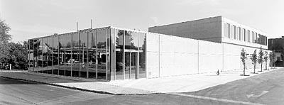 Im Erdgeschoß etwa macht die straßenseitige, um die Ecke gezogene, raumhohe Verglasung den Supermarkt einsehbar, und die parkplatzseitige Zinkverblechung am hinteren Ende der Längsfassade bildet die Anlieferungs- und Lagerzone des Supermarktes ab. Das fast raumhohe Fensterband der beiden Längsfassaden im Büroteil demonstriert ebensolche Eindeutigkeit, und nach hinten, zur Wohnbebauung, schaut eine nüchterne Sichtbetonwand, die nur durch die zurückgesetzte Bürobox und natürlich die minuziöse Fugenteilung der Ortbetonfronten differenziert ist. Diese Differenzierung ist minimal – und doch gleitet der Blick nicht einfach darüber hinweg; sie bietet genau soviel visuellen Halt, wie es unbedingt braucht.