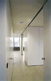 Es gibt also beides: Offenheit und räumlichen Fluß, wenn es aber temporär gebraucht wird, dann läßt sich mit einem Handgriff auch eine abgeschlossene Raumsituation schaffen. Das einzige, was hier nicht ganz geglückt ist, ist er Fußboden. Er stimmt farblich nicht, er ist nicht gut ausgeführt. Aber das sind Abstriche, die der Architekt in Kauf nehmen muß, wenn er nur über Dritte, über den Generalunternehmer, mit den beauftragten Firmen kommunizieren kann. So rigoros reduzierte Konzepte, die auf eine perfekte Ausführung angewiesen sind, leiden darunter.