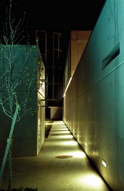 Und genau das zeigt das Gebäude, denn es besteht aus zwei entsprechend unterschiedlich dimensionierten aufeinandergestapelten Schachteln, die durch eine – abends unterleuchtete – Fuge getrennt sind, sodaß im Dunkeln wirklich der Eindruck entsteht, die kleine Schachtel schwebe über der größeren.
