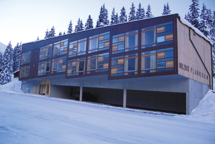 Modulares Bauen, Serienproduktion, Flexibilität, Ortsungebundenheit, all dies suggeriert der vor rund fünf Jahren formulierte Anspruch von HolzBox. Das Innsbrucker Architekturbüro konnte 2003 den Wettbewerb der steiermärkischen Landesregierung für ein multifunktionales Campmodul für Jugendliche und Familien für sich entscheiden. Das modulare Musterkonzept sollte die architektonische, infrastrukturelle und funktionale Qualität von Ferienherbergen verbessern. Gefordert waren ein Betreuermodul mit einem Bett, ein Jugendraummodul mit sechs und ein Familienmodul mit vier bis fünf Betten. Die Lösung von HolzBox war einfach: drei gleich lange, beliebig kombinierbare Containermodule aus Massivholzplatten. Denn obwohl ursprünglich eine Ausführung in Holzrahmenbauweise geplant war, entschieden sich die Architekten im Lauf des Umsetzungsprozesses für die Holzmassivbauweise mit Brettsperrholzplatten, da diese, so Ferdinand Reiter, der Architektur viel eher entsprach und nicht zuletzt aufgrund der geografischen Nähe zu den steirischen Produzenten auf der Hand lag.