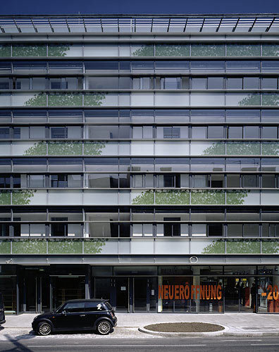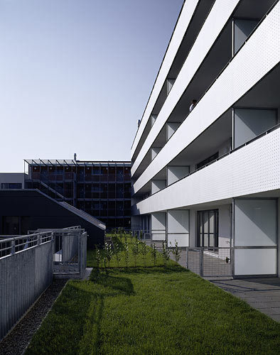Sonnenschutzlamellen lassen die zurückgesetzte Dachzone himmelwärts gleiten. Die pergolagedeckte Terrasse mit Panoramablick über kleinteilige Hinterhaus- und Hoflandschaften bis hin zu den Gasometern und zum Millennium - Tower gehört gleichermaßen Bewohnern und Studenten. Nach allen Regeln der Kunst feiert der zentrale Innenhof mit der langen, grünen Terrasse im ersten Stock die studentische Gemeinschaft.