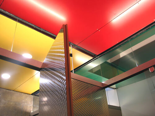 Was mir gleich aufgefallen ist: Auf dem Ganzen lastet ein dickes Dach. Aber das Rätselraten, was in dieser dicken Dachschicht enthalten sein könnte, hatte bald ein Ende. Steixner hat die „Hutkrempen“ der umliegenden Pavillons in seiner Architektur weitergeführt. Das war ganz bestimmt richtig. Er hat natürlich besonders auf Oberflächen gesetzt, die industriell, hart, glatt sind. Das heißt, seine Mischkonstruktion aus Stahl und Holz und zwei Sichtbetonscheiben ist entsprechend gerüstet. Die Betonscheiben sind mit einer Glasfaserbeschichtung ausgestattet, alles Übrige mit Aluminiumpaneelen verkleidet - innen teilweise farbig pulverbeschichtet.