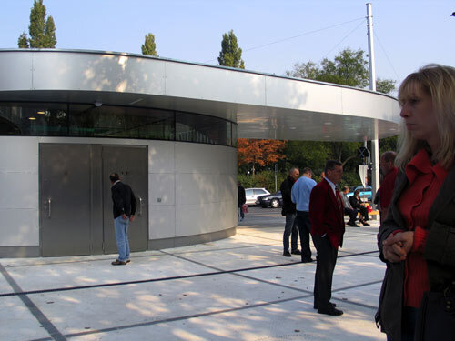 Der Baukörper der öffentlichen Bedürfnisanstalt setzt sich in ein weit auskragendes Dach fort: darunter eine Sitzbank für diejenigen, die auf den Bus warten. Früher war hier eine Luigi-Blau-Haltestelle. Wie die aussehen, weiß man; sie sind - entsprechend den Vorgaben des Bauherrn - ziemlich klein. Jetzt ist viel mehr Platz da - und er ist trotzdem wettergeschützt. Das muss man als Plus verbuchen.