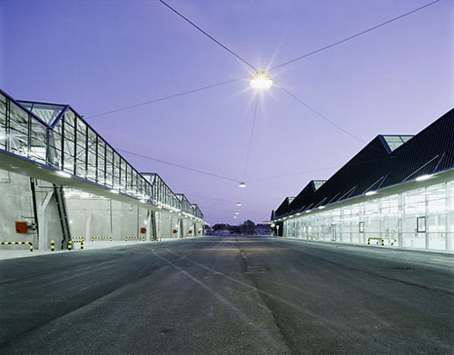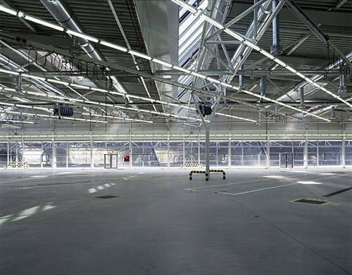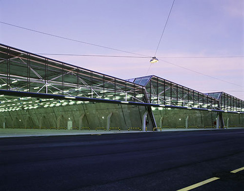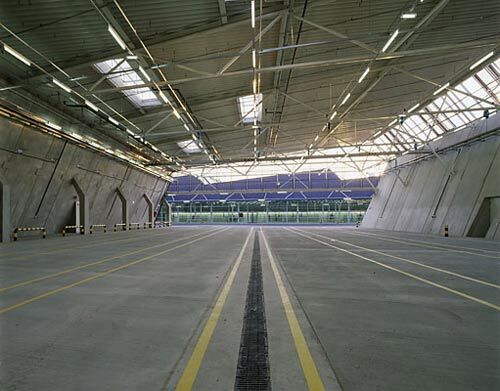Immer noch kann sich die Konstruktion sehen lassen. Wie von Engelshand getragen wird jede einzelne der fünf Garagenhallen von einem zarten Raumfachwerk bedeckt. Durch Knickung zu Sheddächern - ein altbewährtes Element aus den Anfängen des Industriebaus - gelangt reichlich Streulicht in die Hallen. Eine künstliche Belichtung wird man untertags wohl gar nicht brauchen.