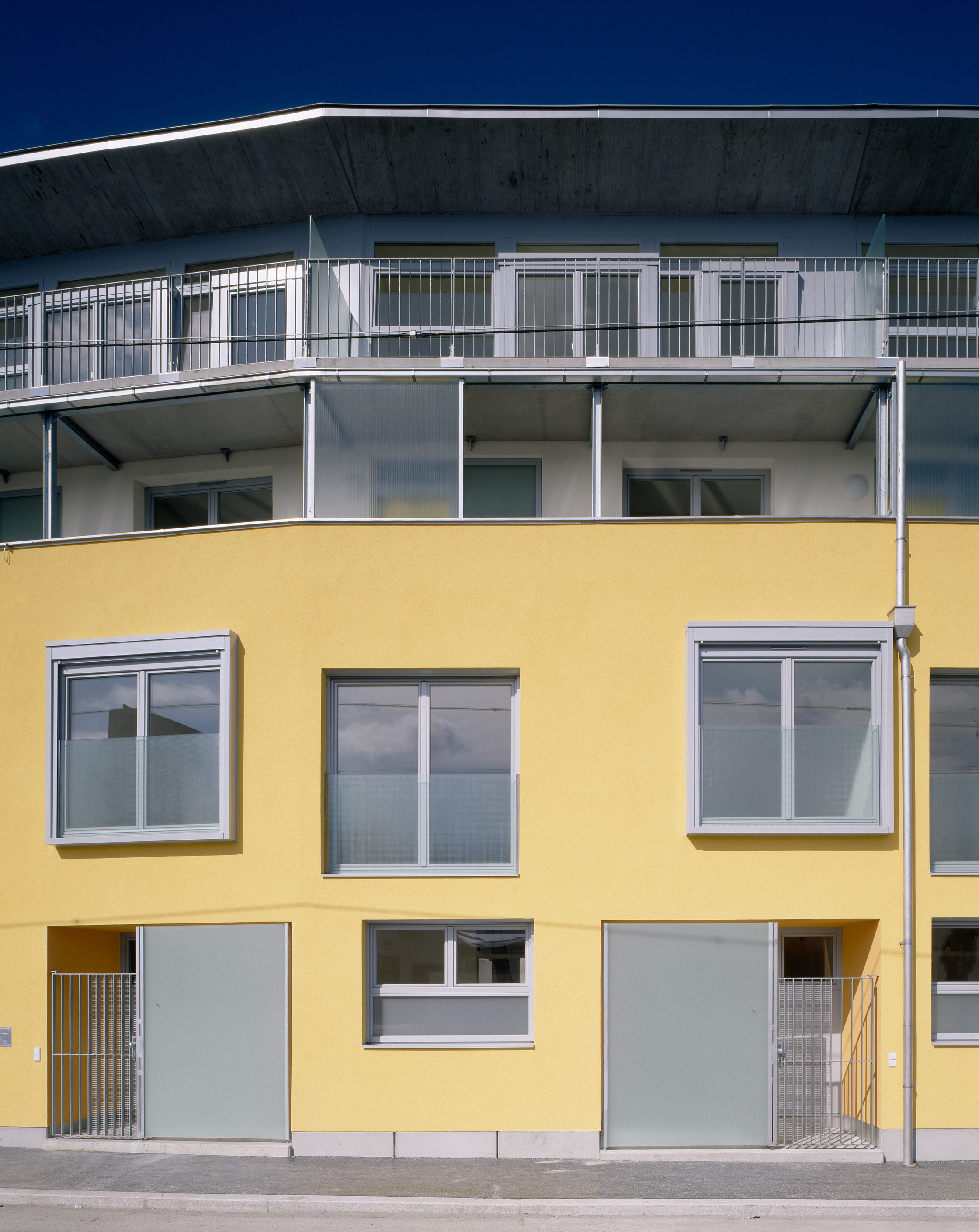 Jede der unteren Maisonetten hat ihre eigene Eingangszone und ihren eigenen Garten am Hof. Harmonisch geht die Zeile in die angrenzende Biedermeierbebauung über. Der offene Laubengang darüber bildet eine Zäsur zum leichten Abschluss des Hauses, auf dem windschützendes Strukturglas den gelben Türen ein Davor bietet. Der Baulinie folgend schmiegt sich das gelb verputzte Haus mit seinen tanzenden Fenstervariationen an die Straßenkurve. Subtil betonen die leicht unterschiedlich geneigten Fassadensegmente den individuellen Charakter jeder einzelnen Wohnung.