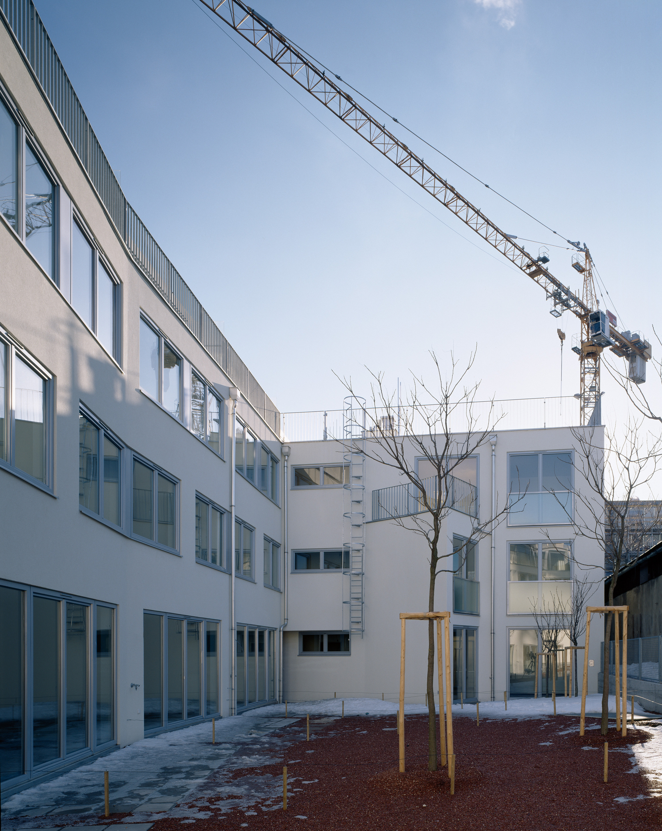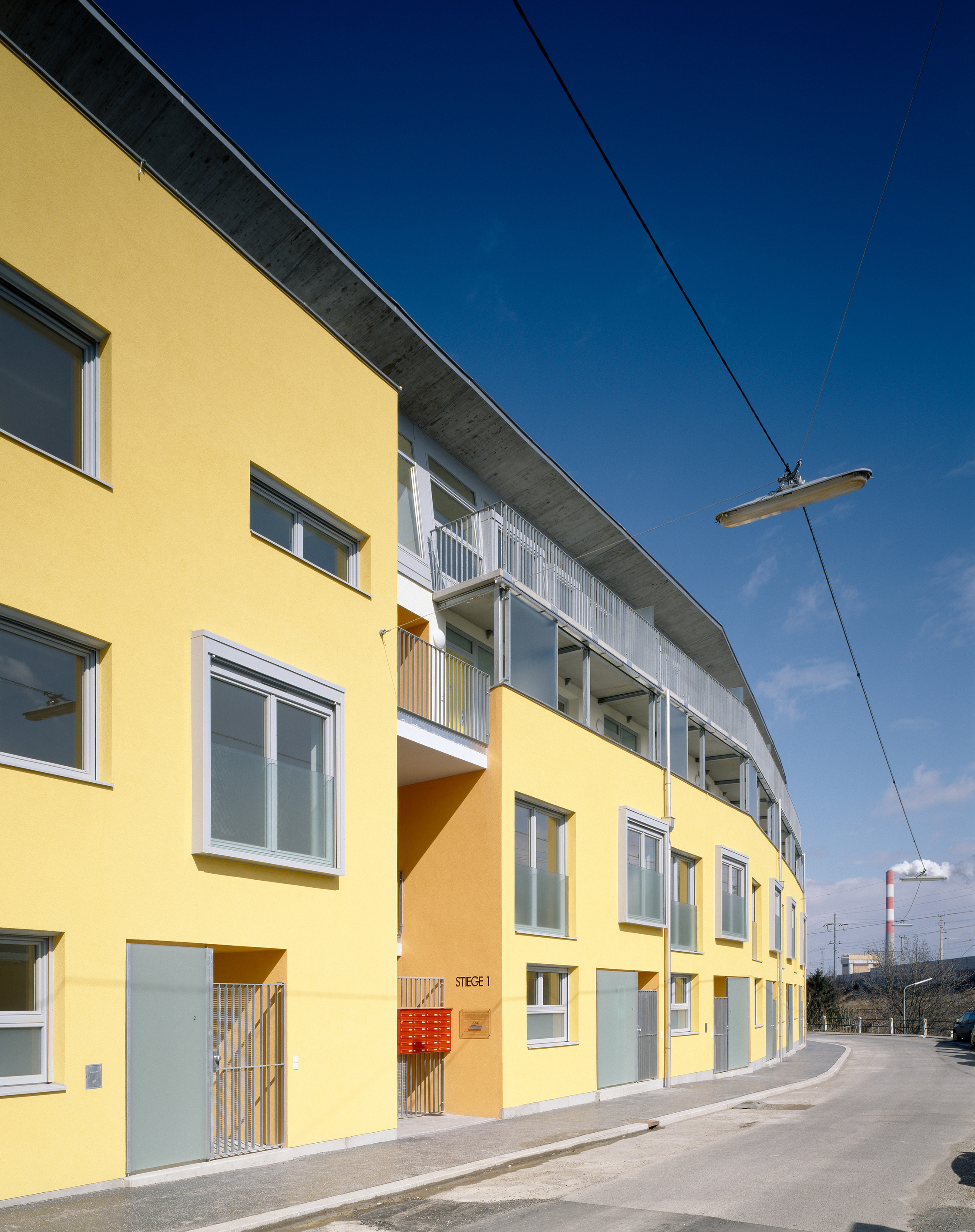 Direkt gegenüber liegt eine bananenförmige Parzelle, deren gebrochene Baulinie an der südöstlich gelegenen Straße die längste Zeit der alten Bestandsstruktur folgte. Für den Bauträger, die Wohnbauvereinigung für Privatangestellte, realisierte das Architekturbüro Schwalm-Theiss & Gressenbauer einen vierstöckigen Wohnbau mit insgesamt 22 Einheiten, der reizvoll gebrochen um die Kurve knickt und wie ein gelber Waggon im brüchigen Stück Stadt zum Stillstand gekommen ist.