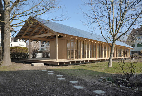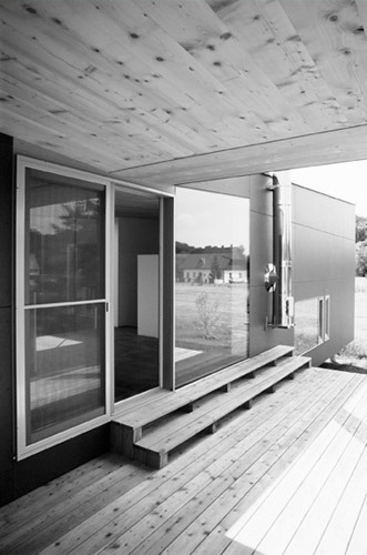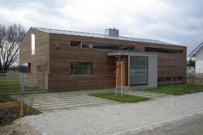 Draußen vorm Haus. Am Eingang steht ein winterkahler Amba-Ahorn. Die Fassade aus graugrünen Eternitplatten bietet ihm einen passenden Hintergrund. An der Westseite drängt sich die Massivholzdecke des Innenraums nach außen und geht in ein Vordach über. Wind- und blickgeschützt kann man hier in der Abendsonne liegen und über Sitzstufen in den Garten hinausgehen. „Wir haben mit der Terrasse große Freude“, sagt die Baufrau, „bis Ende Oktober können wir unbedenklich draußen sitzen.“