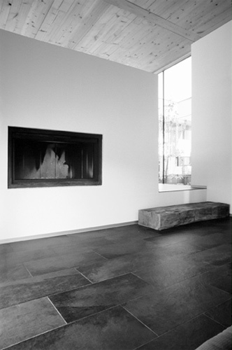 Die Essenz all dessen wurde schließlich in einen Entwurf gegossen: ein Atriumhaus, das auf einer aufgeständerten Bodenplatte federleicht über dem Gelände schwebt. In nur drei Tagen stand der Holzbau. Sorgfältig wurde er so ins Grundstück gesetzt, dass auch die flache Wintersonne in den verglasten Innenhof strömen kann. Feinakkordiert gruppieren sich sämtliche Räume um diesen Innenhof. Er ist der kontemplative Angelpunkt, um den das Wohnen kreist. Morgens bis abends scheint hier die Sonne. Gelegentlich kommt ein Haustier aus Nachbars Garten zu Besuch, schlüpft unter dem Haus hindurch und nimmt im sonnigen Atrium Platz.