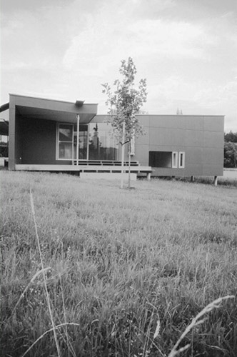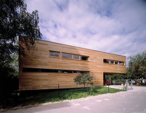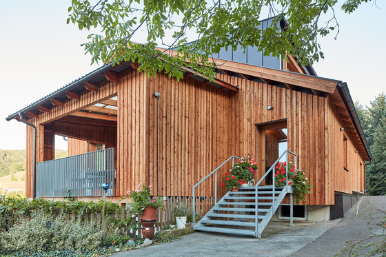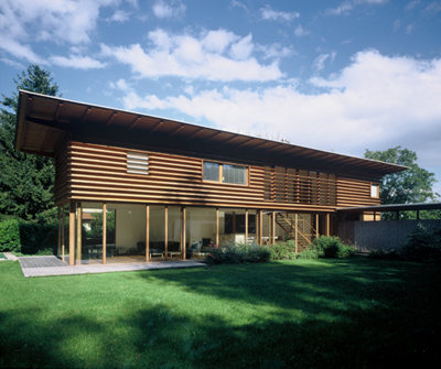 Draußen vorm Haus. Am Eingang steht ein winterkahler Amba-Ahorn. Die Fassade aus graugrünen Eternitplatten bietet ihm einen passenden Hintergrund. An der Westseite drängt sich die Massivholzdecke des Innenraums nach außen und geht in ein Vordach über. Wind- und blickgeschützt kann man hier in der Abendsonne liegen und über Sitzstufen in den Garten hinausgehen. „Wir haben mit der Terrasse große Freude“, sagt die Baufrau, „bis Ende Oktober können wir unbedenklich draußen sitzen.“
