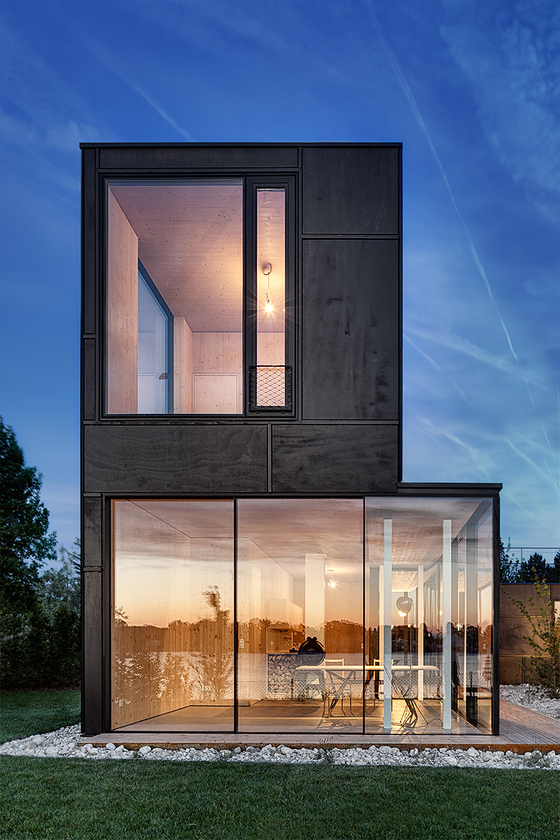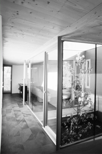 Die Essenz all dessen wurde schließlich in einen Entwurf gegossen: ein Atriumhaus, das auf einer aufgeständerten Bodenplatte federleicht über dem Gelände schwebt. In nur drei Tagen stand der Holzbau. Sorgfältig wurde er so ins Grundstück gesetzt, dass auch die flache Wintersonne in den verglasten Innenhof strömen kann. Feinakkordiert gruppieren sich sämtliche Räume um diesen Innenhof. Er ist der kontemplative Angelpunkt, um den das Wohnen kreist. Morgens bis abends scheint hier die Sonne. Gelegentlich kommt ein Haustier aus Nachbars Garten zu Besuch, schlüpft unter dem Haus hindurch und nimmt im sonnigen Atrium Platz.
