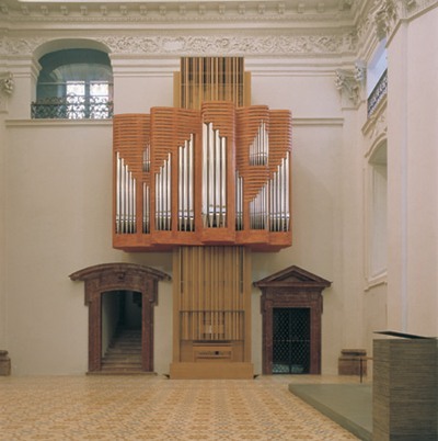 Aus dem unterschiedlichen Zugang von Orgelbauer und gestaltgebendem Architekten wird ein Korpus, der die klassische Fünfgliedrigkeit der Pfeifen in asymmetrische Falten kleidet. So entsteht der Eindruck geringerer Tiefe und eine imaginäre Schräge, die zum Hochaltar weist. Das Altarpodest ist als klar abgesetzte zweite Ebene in monochromen großformatigen Steinplatten über den unschönen Fliesenboden aus der Ära der historisierenden Umbauten des 19. Jahrhunderts geschoben. Es reicht in den Kuppelraum hinein, um dem neuen Altar vor dem Presbyterium Raum zu geben. Dieser, ein vom bekannten deutschen Bildhauer Ulrich Rückriem ausgewählter Steinblock aus Anröchter Dolomit, ist nur minimal bearbeitet. Für den Ambo schichtet der Architekt zentimeterstarke Stahlplatten mit unscharfen Kanten übereinander. In seiner fast archaischen Schlichtheit stellt der neue Liturgiebereich ein Ganzes dar, das mit dem nun dahinterstehenden Hochaltar, einem Hauptwerk hochbarocker Altargestaltungen in Österreich, nicht konkurriert.