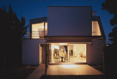 Denn: Zu ebener Erde wird gewohnt, im Geschoß darüber liegen zwei Schlafräume, ein großzügiges Badezimmer und ein Garderobenraum. Bei einer erlaubten Bauhöhe von 4,5 Metern und einer tatsächlichen von zweimal 2,80 Metern ergibt sich dennoch eine Ungereimtheit. Mit 5,60 Metern ist das Haus - gemessen an den Bauvorschriften - scheinbar zu hoch. Scheinbar. Denn das Gesetz läßt es zu, daß durch „ausgleichende“ Maßnahmen bestimmte Überschreitungen auch wieder relativiert werden. Die Fassadenfläche muß insgesamt stimmen, auch die Höhe, auch die Baufluchtlinien, aber wie der Architekt im Detail damit umgeht, das ist ein anderes Kapitel.