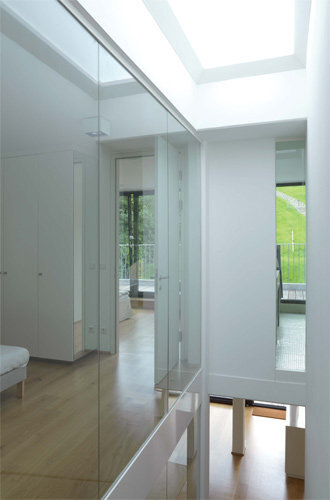 Das transparente Entree darunter erschließt zwei potentielle Einliegerwohnungen. Hier schlüpfen die Bauherren tagtäglich vom Parkplatz ins Haus. Im hellen Vorraum der Schlafebene bewirkt die Glaswand der Treppe ihr letztes Wunder. Sie taucht den Schrankraum in helles Licht. Dahinter teilen sich Elternschlafzimmer und Bad die Terrasse. Im Norden buchten sich die Kindererker mit Balkon aus. Durch ihre Fenster winkt die Kirche - diesmal jedoch in Vogelperspektive.