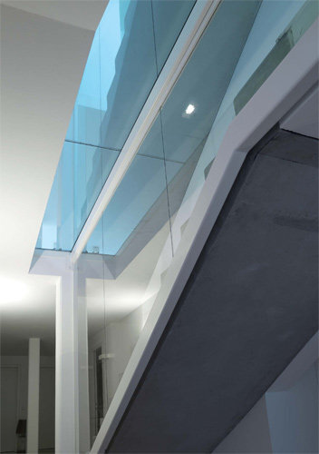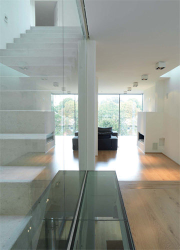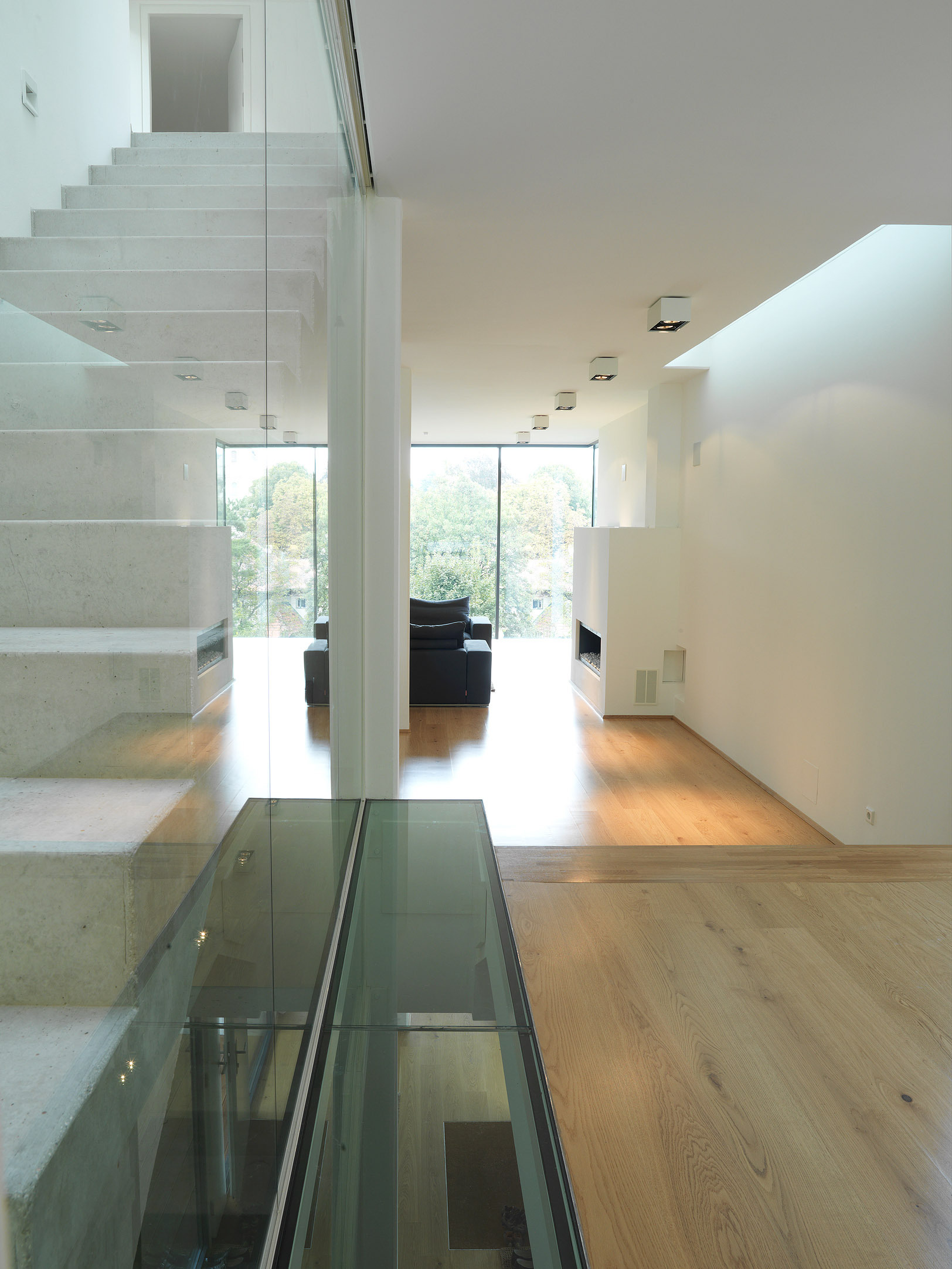 „Die Grundrisslösung auf dem engen Grund war extrem schwierig. Ich wollte auf keinen Fall, dass ein Kellergefühl entsteht“, so Heiss, „das Herz des Hauses sollte lichtdurchflutet und hell sein.“ Schon beim Hauseingang zeigt sich die ganze Pracht der Helligkeit: Durch die Glaswand entlang der Stiege und durch bewusst inszenierte Wandschlitze kann man von hier bereits in die oberen Ebenen emporspähen. Der Ausblicke nicht genug: „Wir leben hier miteinander, nicht nebeneinander“, sagt die Baufrau, „man kann in der Badewanne liegen und ins Wohnzimmer schauen. Die Kinder lieben diese Glasfläche. Sie sehen sofort, wer gerade kommt.“
