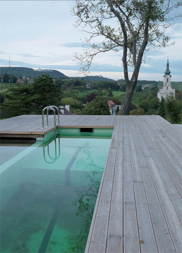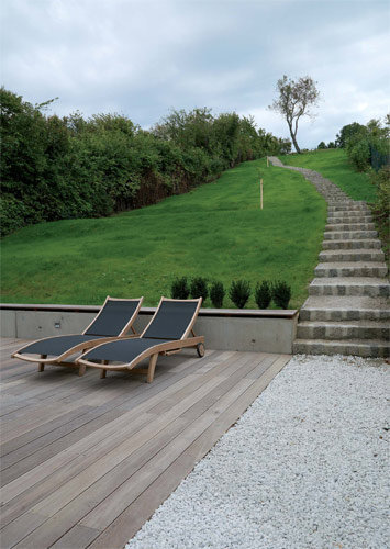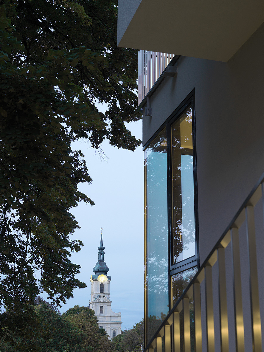 Als Architekt Christian Heiss auf dem Grund in Döblinger Bestlage stand, war es um ihn geschehen. „Die Länge hat mir gleich gefallen, ganz oben findet man eine für Wien einzigartige Ruhe.“ Ein abgetreppter Weg zelebriert den Aufstieg zum lauschigen Rasenplatz an der Spitze. Unter den Baumkronen der nachbarlichen Linden führt er von der Straße aus am Westrand des Grunds in einem sachten Bogen bis hin zur Terrasse, die zum Sonnenbaden einlädt. „Von hier aus gibt es diesen sehr, sehr schönen Blickpunkt auf die Kaasgrabenkirche. Es ist etwas Besonderes, so einen Maßanzug für eine Familie zu gestalten.“