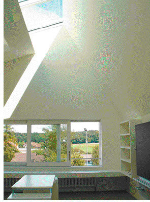 Um Alt und Neu zu verschmelzen, haben sie die Silhouette der alten Trakte mit ihren überdimensionierten braunen Eternitdächern und dem weissen Sockelgeschoss übernommen. Statt einem nutzlosen Estrichraum unter dem Dach (Bild 3), bringen sie jeweils über ein Shed viel Tageslicht in die Schulzimmer, was zu neuen innenräumlichen Qualitäten führt. Dadurch ensteht äusserlich eine zusammenhängende Dachlandschaft, ohne dass sich das Gebäude als Nachahmung zu erkennen gibt. Vielmehr behauptet es sich deutlich als neuer Teil des Ganzen.