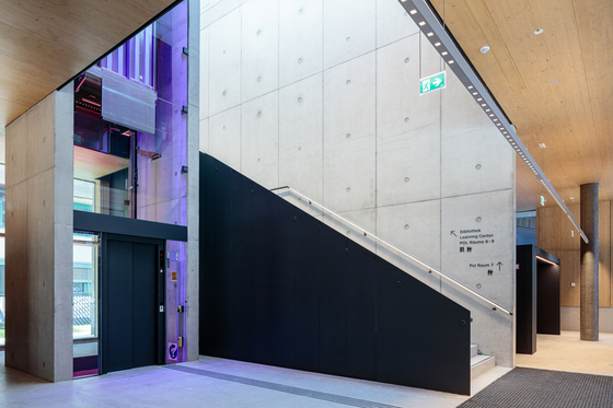 Die Räume und vor allem das Atrium wirken hell und leicht. Die weiten Freiflächen, der große Luftraum und vielerlei Ausblicke leisten dazu ihren Beitrag und lassen die Schwere der Konstruktion kaum spüren. Um die ¬Effekte der energetischen Bauteilaktivierung optimal nutzen zu können, wurden die tragenden Innenwände und die Decken in Sichtbeton ausgeführt. Die Wände erhielten dabei eine samtig weiche Oberfläche, die ¬Decken hingegen litten bei der Herstellung etwas unter der Vielzahl technischer Einbauten und gelegentlichen Verzögerungen bei der Verarbeitung. Für das erklärte Lieblingsbaumaterial vieler Architekten sprachen ganz banale Argumente: »c’est plus durable« – die Oberflächen sind einfach ¬widerstandsfähiger und bilden zusammen mit großflächigen Eichenholzverkleidungen und etwas Stahl und Glas einen sachlichen aber freundlichen Rahmen, der das bunte Kindertreiben samt dessen gestalterischer Äußerungen bestens verträgt. Die terrazzoartige Optik der weichen Böden resultiert aus einem PU-gebundenen Gummigranulat, dessen Oberfläche geschliffen und mit einem elastischen PU-Harz versiegelt wurde.