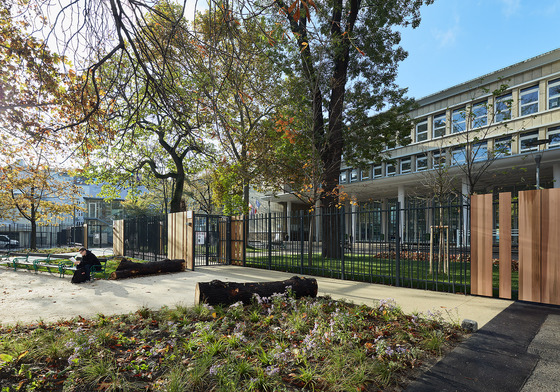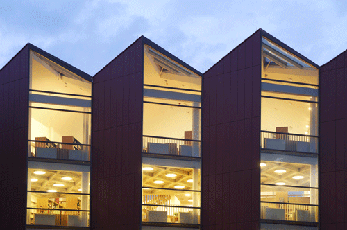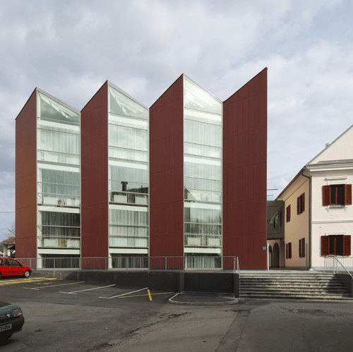 Die Schale wirkt auf der den Wohnblocks zugewandten Rückseite kompakt und sichert deren Bewohnern ihre Privatsphäre. Das Farbsystem in Rot und Beige entspricht den Farben und Materialien des Altbaus. Das gefaltete Dach nimmt die Form der Satteldächer von der benachbarten Bebauung auf.