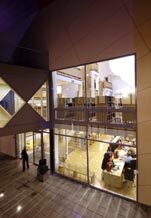 Der gewaltige Raum des Lesesaals wirkt luxuriös und ausschweifend. Doch in Verbindung mit der Wärme des Fußbodens und der Möblierung aus Eiche, den neutralen, weiß verputzten Wänden und den groben Sichtbetondecken entsteht auch ein flüchtiges Spiel zwischen Respekt einflößender Monumentalität und spielerischer Heiterkeit. Anstelle der normalerweise in Arbeitsräumen herrschenden Grabesstille lebt der Raum hier von den Geräuschen der Menschen, die ihn als städtischen Wohnraum nutzen.