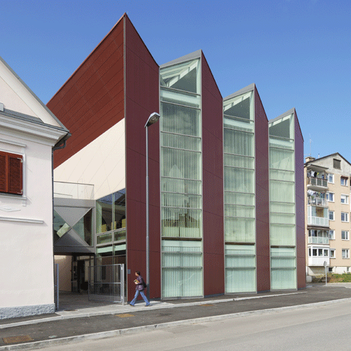 Die Bücherei des kleinen, südöstlich von Ljubljana gelegenen Ortes war lange Zeit in einem ehemaligen herrschaftlichen Haus untergebracht. Der wachsende Raumbedarf führte zur Erweiterung um einen signalhaften Funktionsbau, der mit Elementen des disparaten Umfeldes spielt und dabei der Ortsmitte wie auch dem altehrwürdigen Gebäude neue Wertigkeit zukommen lässt.