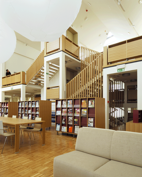 Die Wettbewerbsausschreibung forderte für das Innere des neuen Gebäudes offene Räume, um dem Bibliothekspersonal die Aufsicht zu erleichtern. Die Mehrzahl der Bücher und sonstigen Medien sollte auf für die Besucher zugänglichen Regalen untergebracht werden. Besonders zu berücksichtigen waren junge Leser. Die Lösung für diese unterschiedlichen Forderungen lag in einer genau überlegten Organisation der Raumfolge. Der Eingang im Erdgeschoss mit dem geschäftigen Schalterbereich ist optisch mit den tiefer liegenden, abgestuften Ebenen der Kinderabteilung verbunden. Über der stark strukturierten Betondecke der Halle im Erdgeschoss sind die wichtigsten Funktionen der Bibliothek angeordnet. Hier wurde der Raum vertikal in zwei Bereiche geteilt: Der große, zweigeschossige Lesesaal liegt an der Ostseite, während die Westseite dicht gestapelte, mit Bücherregalen angefüllte Ebenen enthält. Das verbindende Element zwischen der ausgedehnten Leere des Lesesaals und der Dichte des Buchbestands bildet ein liebevoll gestaltetes Treppenhaus mit zusätzlichen Podesten, die als weitere intime Lesebereiche dienen. Die Materialien und Details sind schlicht und minimalistisch, natürliche Belichtung wird maximal genutzt.