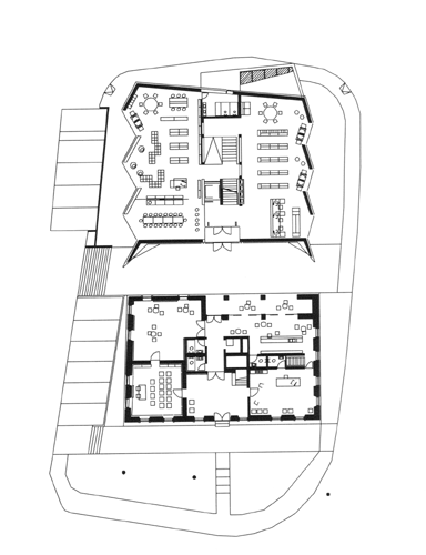 Das kleine Grundstück hinter dem Altbau von 1889, dem einzigen denkmalgeschützten Gebäude der Stadt, umgeben von gesichtslosen sozialistischen Wohnblocks der sechziger Jahre und mit Blick auf die geneigten Dächer von Einfamilienhäusern weiter hinten, kann kaum als Traumlage bezeichnet werden. Da die Architekten von A.Biro eine respektvolle Haltung gegenüber dem bestehenden Kontext vertreten, sahen sie ihre Aufgabe darin, der vorgefundenen Vielfalt gerecht zu werden und zugleich entgegenzuwirken, eine Verbindung zur Planlosigkeit der städtischen Situation herzustellen und sich zugleich von ihr zu distanzieren. Die im Zickzack gefaltete Betonschale bot dafür viele Spielarten. Der Bau ist als selbstständiges Volumen konzipiert, das der historischen Bibliothek den ihr gebührenden Respekt zollt, mit der er nur durch eine verglaste Brücke verbunden ist. Blickt man von der Hauptstraße auf den Neubau, scheinen die einheitlichen Glasflächen mit dem Hintergrund aus den sechziger Jahren zu verschmelzen und stellen zugleich das Innere zur Schau.