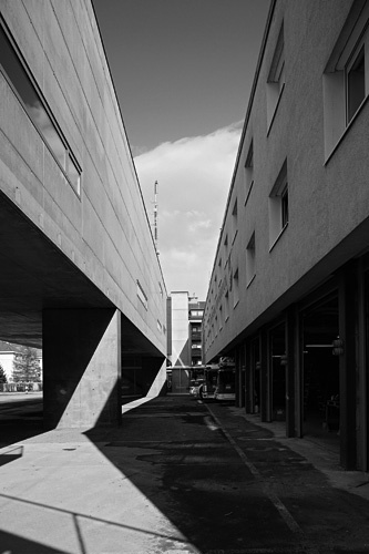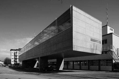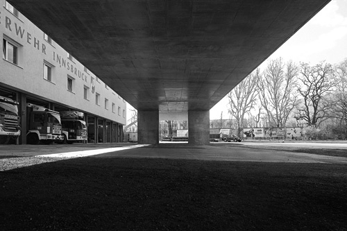 Denn im Wettbewerb des Jahres 2004 war für diese Institution noch an eine Aufstockung der Hauptfeuerwache Innsbruck gedacht. Etwa im Umfang von 700 Quadratmeter Nutzfläche. Den Zuschlag hat die Architektengemeinschaft Obermoser/Schlögl & Süß nicht zuletzt deshalb errungen, weil sie sich ihre eigenen Gedanken über die konkrete Situation gemacht hat. Anders ausgedrückt: Die Architekten haben als Einzige im Verfahren einen alternativen Vorschlag unterbreitet. Sie haben nicht die Hauptfeuerwache aufgestockt, sie haben vielmehr ein eigenes, aufgeständertes Gebäude in einem Abstand von nur fünf Metern davorgestellt. Der städtebaulichen Situation entsprach dieser Vorschlag sowieso viel besser. Und auch ohne die Vorgabe der doppelten Erdbebensicherheit hat man sich mit diesem Projekt aufwendige statische Sekundärkonstruktionen im Bestand erspart.