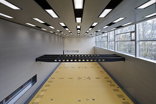 Dass es schwebt, ist kein architektonischer Willkürakt, es ist nackte Funktion. Denn die Feuerwehr fährt drunter durch. Im Übrigen wirkt der gewaltige Riegel wie ein großes Brückengebäude. Dieser Beton-Querbalken erscheint aber nicht abweisend. An der Nord- und Zugangsseite hat er im oberen Bereich ein sehr breites Glasband, Festungscharakter hat das Haus also nicht. Und vor allem sorgt die architektonische Lösung für eine Tageslichtsituation im Inneren, im sehr eindrucksvollen Herzen der ILL,die den zahlreichen Mitarbeitern bei ihrer verantwortungsvollen Bildschirmarbeit eine angenehme Raumatmosphäre bietet.