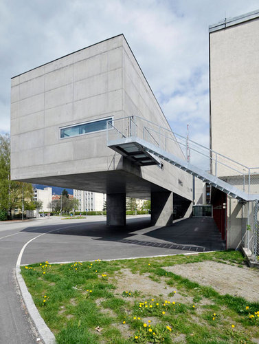 Die Genesis des Projekts verlief jedenfalls nicht uninteressant. Die Nutzflächenforderung hat sich fast verdoppelt – jetzt stehen knapp 1400 Quadratmeter zur Verfügung –, und die Sicherheitsanforderungen haben sich letztlich so verschärft, dass sich die Architekten schweren Herzens von ihrem Wettbewerbsprojekt – eine leichte Stahl-Glas-Konstruktion – verabschieden mussten. Es wäre nicht nur unglaublich teuer geworden, es hätte durch die notwendigen Dimensionierungen der Konstruktion auch ihren ästhetischen Ansprüchen nicht mehr genügt. Und so wurde eine Betonschachtel daraus. Aber sie hat die Kraft, die in der Architektur jedem einfachen geometrischen Volumen innewohnt. Sie hat aber auch die Kraft, die aus einer rohen, „brutalen“ Materialisierungresultiert. Das Gebäude – immerhin ist es aus Beton – wirkt naturgemäß sehr schwer, das spürt man physisch. Der Reiz liegt darin, dass es trotzdem schwebt. Statisch wird es aber von nur vier Scheiben und dem Stiegenhauskern gehalten. Dabei beträgt die Spannweite 40 Meter. Und das bei einer Gebäudelänge von insgesamt 65,5 Metern.