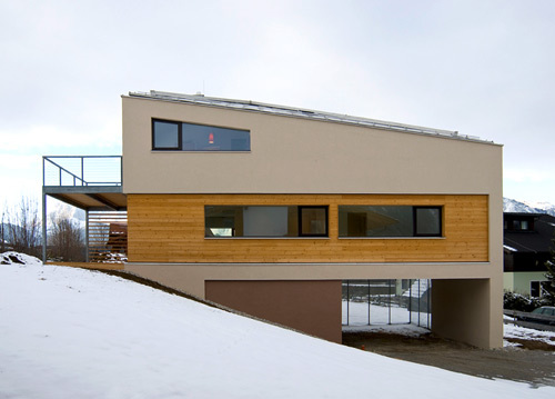 Und schließlich die Südostflanke des Grundstücks: Lose aneinander gereihte Würfelhäuser mit Mietergärten zu ebener Erde bilden hier den Abschluss der heterogenen - und doch stimmigen - Wohnhausanlage. Zwischen die Baukörper ist paarweise je ein offenes Stiegenhaus eingeschoben. Die oberen Geschoße sind gegeneinander versetzt. Auf diese Weise bildet der Wohnraum im zweiten Stock gemeinsam mit der südwestwärts orientierten Terrasse einen Stock tiefer einen gedeckten und begehbaren Freiraum. Hier beginnt die ländliche Umgebung, hier kann man dolomitische Bergluft atmen.