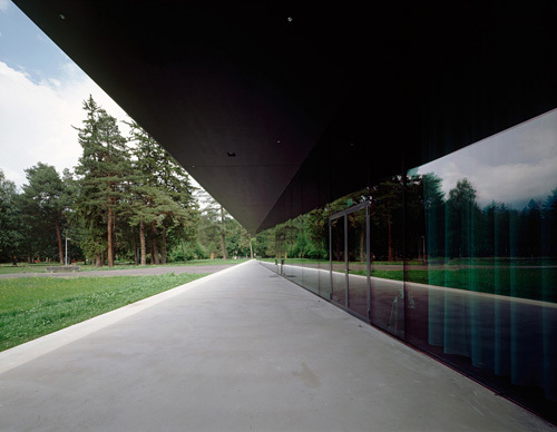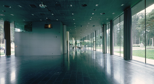 Sämtliche Hauptnutzungen – Garderobe, ein Foyer mit Leseraum, ein großer Saal für ca. 300 Personen im Osten, ein kleinerer Saal für ca. 100 Personen in der Mitte und ein Restaurant im Westen – befinden sich auf einer Ebene mit dem umgebenden Außenbereich des Kurparks. Das im Nordwesten weit ausladende Dach überdeckt die Freiplätze des Restaurants und erlaubt überdachte Veranstaltungen im Freien. Parkplätze sind nur im Norden vorgesehen, im Osten wurde die Rasenfläche erweitert, womit die Konferenzräume rundum vom Park umgeben sind. (Text: Claudia Wedekind nach einem Text der Architekten)