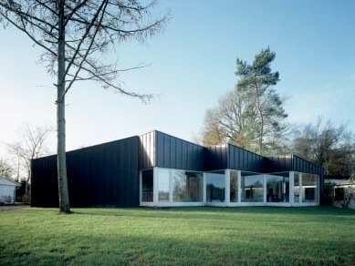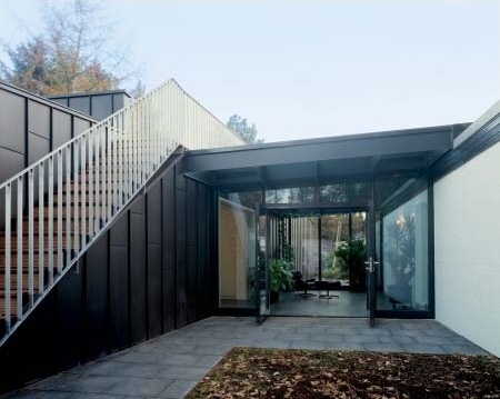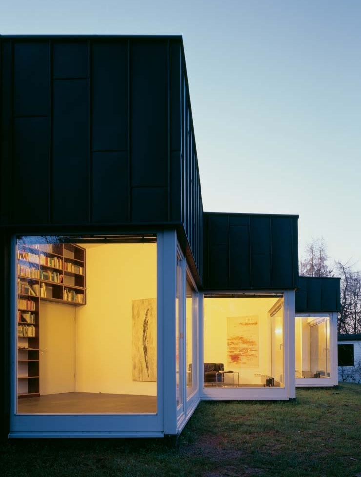 Das Haus aus den siebziger Jahren, dessen Architektur dem Prinzip addierter Scheiben folgt, erhielt auf seiner Nordseite eine Erweiterung. Die Gestaltung des Anbaus verweist zwar auf Formen und Farben der Siebziger, findet aber einen eigenständigen Ausdruck und entwickelt neben skulpturalen auch eine ganze Reihe von funktionalen Qualitäten.