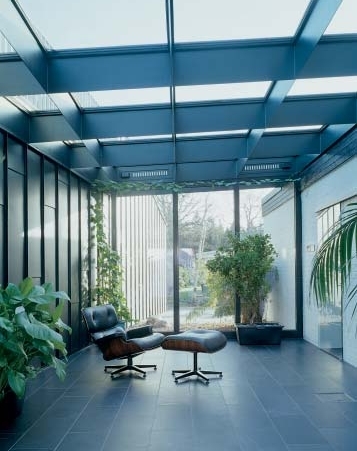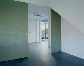 Zwischen Ursprungs- und Ergänzungsbau wurde ein Wintergarten eingeschoben, der vom Garten in die beiden Haushälften leitet. Er ist mittlerweile zum Treffpunkt der Familie geworden, weil man sich hier an zentraler Stelle geschützt und doch fast in der Natur aufhalten kann, mit Blick ins Grüne und in den Himmel. Beim Betreten des Anbaus überrascht die Größe im Kleinen, die bei aller räumlichen Beschränktheit zu spüren ist. Drei in Richtung Nordost ausgerichtete Räume liegen hintereinander an einem Flur, an dessen Ende sich, innenliegend, ein Nassbereich befindet. Abgeschlossen wird das Gebäude von einer Garage mit zwei Stellplätzen. Die drei Zimmer besitzen eine schräge, abgewinkelte Fensterfront, die sehr skulptural wirkt, aber vor allem die Aufgabe hat, bei der ungünstigen Nordlage möglichst viel Licht in die Räume zu leiten. Das funktioniert – selbst an trüben Tagen ist es hell wie in Südzimmern. Zudem kann man durch die im Winkel geführten Fenster einen Panoramablick auf die malerische Landschaft genießen. Die Räume selbst sind einfach und schlicht, aber hochwertig ausgestattet. Alle Böden sind mit Schieferplatten bedeckt, die Einbauschränke und -regale sowie Sideboards wurden aus Multiplexplatten angefertigt; die Regale im Bad sind aus Corian, und zur Beleuchtung genügen zumeist schlichte Leuchtstoffröhren. Für sein Arbeitszimmer hat der Bauherr als Clou eine innen mit Tafellack beschichtete Schiebetür erhalten, auf der er im Vorbeigehen Notizen verfassen kann. Das alles wirkt selbstverständlich, alltagstauglich und angemessen für einen Anbau dieser Größenordnung.