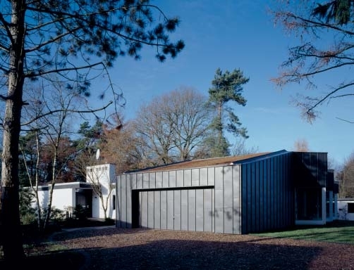 Die neuen Bewohner fühlten sich in ihrem neuen Heim wohl, doch bald wurde klar, dass der Platz nicht für Kinderzimmer, zusätzlichen Arbeitsraum und ein Gästezimmer ausreichte. Ein Abriss und Neubau war keine Option – zu sehr war man dem Charme des Hauses verfallen. Ein ¬befreundeter Fassadenplaner empfahl ein Hamburger Architekturbüro, mit dem er schon öfter zusammengearbeitet hatte – so kamen die jungen Architekten Kunst und Herbert zum Zuge. Sie erkannten sofort den speziellen Reiz des Hauses und beschlossen, sich daran zu orientieren. Der von ihnen entworfene und realisierte Anbau ist ganz anders als der Altbau geraten und doch mit ihm verwandt. Da der größte Teil des idyllischen Grundstücks mit seinen vielen Bäumen tabu für eine Bebauung blieb, beschlossen die Architekten, die Erweiterung direkt an der Nordostseite des Areals, quasi auf der Zufahrt zum Haus, anzusiedeln. Passend zur beengten Lage entwarfen sie ein längliches Gebäude, das sich leicht aus der Flucht des alten Bungalows dreht und von ihm absetzt, um ihn nicht zu sehr zu bedrängen. Der ungewöhnliche Winkel und die parallelogrammartige Grundform des Ergänzungsbaus kann man als eine Reaktion auf die Orthogonalität des Altbaus werten; es ergeben sich daraus aber auch äußerst spannungsreiche Raumsequenzen.