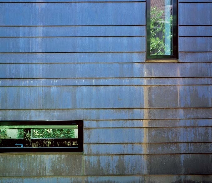 Was es indes vor allem von ähnlich kantigen Strukturen in der Nachbarschaft (Garagen zum Beispiel) unterscheidet, ist die große Sorgfalt, mit der es gestaltet wurde. Die handwerklich meisterliche Ausführung der Kupferbandfassade macht sie im Licht- und Schattenspiel zu einem plastischen Relief, die allmählich bemerkbare Patina, der Grünspan, korrespondiert mit dem Grün der Umgebung … Kurz: Man schaut sich das Haus einfach gern an. Übrigens auch, weil es drinnen – trotz einer gewissen Wehrhaftigkeit der Erscheinung – viel zu sehen gibt. Der Architekt staffierte das »Schaufenster« anfangs sogar extra mit Zeichen aus und erwog Großbildprojektionen, um den Voyeurismus der Leute zu reizen. Und auch hinter den Schlitzfenstern von Steg und Treppenhaus bleiben Bewegungen sichtbar – die Skulptur lebt.