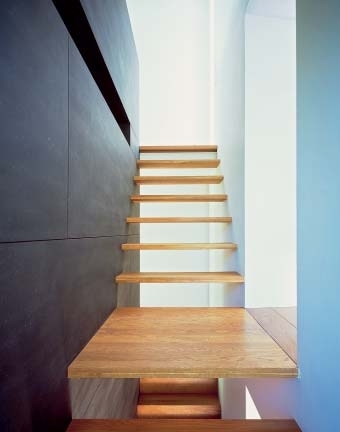 Die interne Organisation des Ensembles ist einfach: Im Altbau trifft sich die Familie, oben wohnen die Kinder – ihnen nimmt der Neubau zwar nicht das Licht wie bei anderen Anbau-Optionen, aber die Aussicht gen Neckar. Der Neubau ist den Eltern vorbehalten, Wohnen, Schlafen, Bad und Ankleide sind hier übereinandergestapelt, verbunden durch einen Treppenschacht, den ein über alle Etagen reichender Schrank von den Wohnräumen trennt. Die Privatheit nimmt also von oben nach unten zu, die Helligkeit ab. Der Verbindungssteg vom Altbau, seitlich verrückt und scheinperspektivisch verlängert, landet auf dem Treppenpodest zwischen Wohn- und Schlafebene. Der Eichendielenboden zieht sich durch Wohnräume wie Treppenhaus (als tragende Stufen) und verbindet fast nahtlos Alt und Neu. Wollte man den Annex später einmal als separate Einheit nutzen, müsste lediglich der Steg gekappt und im Untergeschoss eine Küche eingebaut werden.
