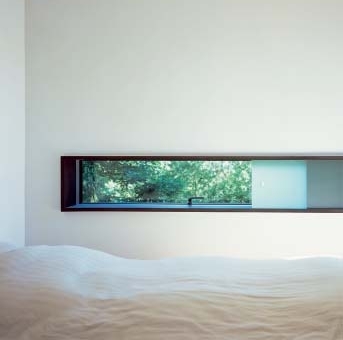 Außenbündig wie dieses Schaufenster in die Wände integriert sind die geschosshohen Schlitzfenster, welche dem Treppenhaus, einer Sonnenuhr gleich, Streifen von Morgen- und Abendlicht bringen. Und man erheischt hier einen raschen Blick auf die Nachbarschaft, auf Leute und Gärten, neben denen man lebt. Der waagerechte Schlitz im Schlafzimmer gewährt den Ruhenden ein Neckarpanorama auf Augenhöhe. Es lässt sich, wie die Schränke, durch Milchglasscheiben verschließen. So bleiben Zeit und Ort im nur scheinbar verschlossenen Haus wohl präsent. Eine entgegenkommende Geste in dieser Hinsicht: Die Fensterflügel eines dänischen Herstellers schwingen nach außen auf. Die schlanken, schwarz beschichteten Aluprofile der Rahmen bzw. Festverglasung sind innen überdämmt, so dass die meisten Öffnungen nur aus Glas bestehen. Dies trägt zur Großzügigkeit des eigentlich kleinen Gebäudes nicht unwesentlich bei.