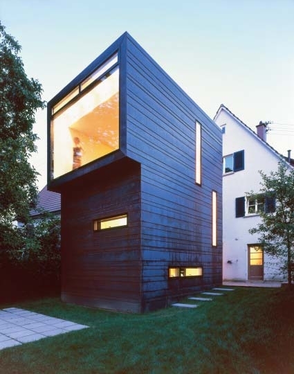 Paradoxerweise wirkt aber das Fremde, Maßstabslose der Skulptur im Grünen gerade verträglicher als ein anpässlerischer Anbau. Das kantige Objekt mit dem schroffen Antlitz ist in diesem Kontext mehr Kunst- als Bauwerk. Baumkronen überragen es, so vergleichsweise klein ist es mit seinen 66 Quadratmetern Nutzfläche; es ist schmaler als das alte Haus dahinter und von der Siedlung aus kaum sichtbar.