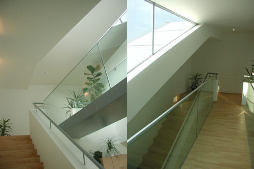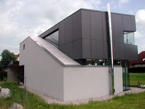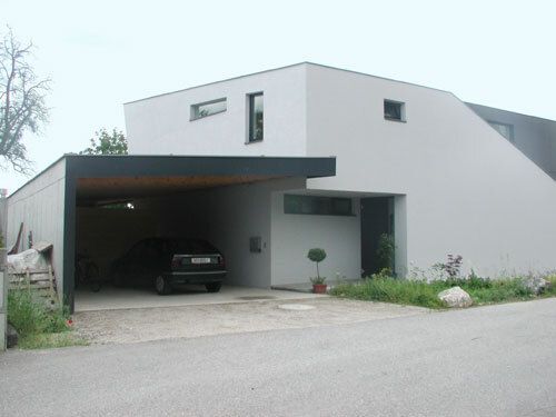 Wie eine Schnecke windet sich das Mauerband ums Haus und umgarnt das dunkle, eternitverkleidete Obergeschoß. In derselben Flucht ragt im Erdgeschoß die lang gezogene Garage wie ein Keil auf die Straße hinaus. Vorn parkt das Auto, im hinteren Ende sind Lager, Werkstatt und Wintergarten untergebracht. In der Garagenbucht liegt der Eingang ins Haus. Er bildet die gesellige Lebensmitte, die sich in der sicheren Umklammerung von Gästetrakt und Wohnbereich öffnen kann. Die massive Wand ist hier nicht nur Schutzpanzer, sondern auch eine wertvolle Speichermasse, um den Niedrigenergiestandard zu halten.
