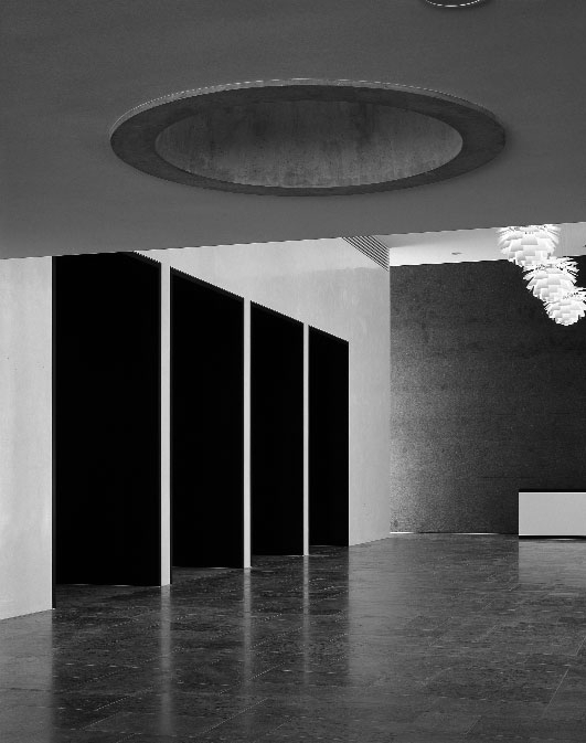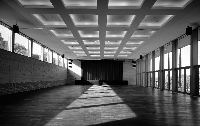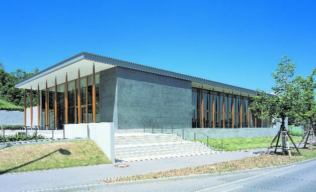 Der Zugang zur Festhalle erfolgt – fußläufig von Weissach und von der Parkplatzanlage kommend – auf der Südseite. Ein westlich des Haupteingangs gelegener Hof erschließt die dienenden Räume der Festhalle. Auch die Kegelbahnen und die Gaststätte werden hierüber erschlossen. Der Anlieferverkehr erfolgt im nördlichen Grundstücksbereich, so dass Überschneidungen von Anliefer- und Besucherverkehr vermieden wurden. Der Gebäudekomplex der Festhalle setzt sich aus zwei Einheiten zusammen. Die Festhalle wurde als eigenständiges Volumen parallel zur Straße positioniert. Das weit auskragende, flache Dach überspannt den Saal und das Foyer und bildet mit seinen Überständen großzügig überdachte Außenbereiche, die ganz selbstverständlich zum Verweilen einladen. Die Fassaden von Foyer und Saal werden durch große Glasflächen zur Landschaft geöffnet. Dem Saal wurde eine »Stadtloggia« vorgelagert, die durch das weite Dach und filigrane Vollholzstützen gebildet wird – eine Austrittsmöglichkeit für die Festhalle, ein Ort der Kommunikation, Archetypus der »res publica«. Das Volumen der Bühne wurde, im Gegensatz zur leichten Dachkonstruktion des Saales, als Massivbaukörper ausgeformt und bildet gewissermaßen das Rückgrat der Komposition. Zudem wurde mit diesem Bauteil eine eindeutige Raumkante entlang des nicht bestimmbaren, nachbarschaftlichen Sammelsuriums geschaffen.