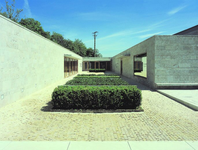 Die Vereins- und Nebenräume sowie die Kegelbahnen einschließlich der zugehörigen Keglerklause wurden auf der Bergseite der Halle angelagert und greifen als erdüberdeckte und bewachsene Gebäudeteile unmerklich in das Gelände ein. Das vorgefundene Motiv der Bruchsteinmauer, zur Abfangung der Hangsituation, wurde als gestalterisches Element in den Fassaden und ihrer Textur aufgenommen. Aus den erdüberdeckten »dienenden Räumen« wurde ein Patio »ausgestanzt«, der die Nutzungsvielfalt von Gaststätte und Vereinsraum bereichert.