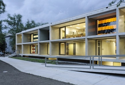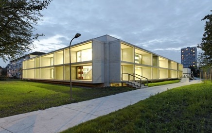A fond homage to the modernist district is also apparent in the large, box-shaped skylights which enlarge the rooms in a similar way to the brise-soleils and mould the incident light. They also shape the buildings’ flat exteriors, lending them a sculptural force and appearing to repeat the surrounding development in miniature on both rooftops. Thus the new architecture’s most striking elements – concrete grid and skylight boxes – echo the existing architecture and in so doing turn the deficiencies of functionalist planning into good architectural quality.
