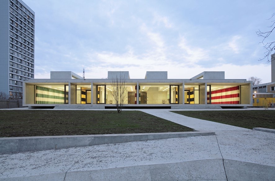 Built between 1955 and 1965, the dormitory suburb of Zurich-Hirzenbach features point and slab high-rises and few low public buildings. At the time, the development was hailed by the city of Zurich for its exemplary architecture; today it is a social hot spot. The school in its midst was built by Charles Steinmann in 1959. Its buildings and grounds were badly in need of renovation and a competition was held for a new kindergarten and day care centre as well as a double gym and additional classrooms.