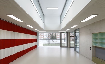 The aforementioned light management, the extension of space outwards and upwards together with the well-judged spatial proportions, give the interiors of these buildings their unexcited matter-of-factness. A wide variety of educational situations becomes possible in the kindergarten building, for instance, through the group rooms that can be added by means of sliding doors or through the fully usable hallways. The kindergarten’s small courtyard flows into a roofed-over play and entrance area which provides access to the kindergarten on the left and the day care centre on the right.