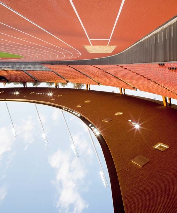 Das Dach ist ein schützender Baldachin und schwebt wie ein ringförmiges Atoll über der oval geschwungenen Promenade und den Zuschauertribünen. Dieses Dach verkörpert die Dynamik des Geschehens. Seine Untersicht ist glatt und wie mit einem Pinselstrich um die Arena gezogen – zum Spielfeld und zur Stadt hin leicht aufgeworfen. Um diesen schwebenden Effekt zu erreichen, wird das Dach von tanzenden Stützenpaaren getragen, so dass sich der weitläufige Raum unter dem Dach ungerichtet auszudehnen scheint und sich die Dachkante mit dem Himmel verwebt. Diese Stützenpaare stehen nicht nur schräg, wobei jede in eine andere Richtung zeigt, sie sind auch noch in sich verdreht. Die architektonische Idee dahinter ist die Ausblendung ihrer Funktionalität – obwohl diese nicht von der Hand zu weisen ist – zugunsten der visuellen Autonomie des schwebenden Daches. Die Verdrehung ist aber auch das Resultat der unterschiedlichen Geometrien des Tribünenkörpers und des Daches, die auf verschiedenen Radien und Zentren basieren. Die Stützen als Verbindungsstück der beiden Ebenen passen sich an den Stützenfüssen der Geometrie der Tribünen an, an den Stützenköpfen der Geometrie des Daches.