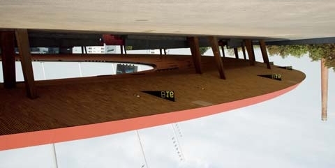 Über dem gesamten Rund »schwebt«, als flaches Band auf 31 Stützenpaaren stehend, eine aus der Horizontalen gekippte Dachkonstruktion. Die Stützenpaare nehmen die Druck- und Zugkräfte des Daches mit Auskragungen bis zu 32 Meter auf und sind trotz der unterschiedlichen Beanspruchungen annähernd in den gleichen Dimensionen ausgeführt. Alle Stützen wurden einzeln in einem dreidimensionalen Verfahren berechnet, um die gewaltige Hebelwirkung der bis 45 Meter langen und 52 Tonnen schweren Binder und die zusätzliche Dachlast zuverlässig ermitteln zu können. Eine Untersicht aus heller ungarischer Robinie lässt das Dach leicht erscheinen, die Verkleidung aus rostendem Cortenstahl dagegen die Zug- und Druckstützen vor dem Stadionhintergrund fast verschwinden. Die Wirkung eines schwebenden Daches könnte nicht überzeugender sein.